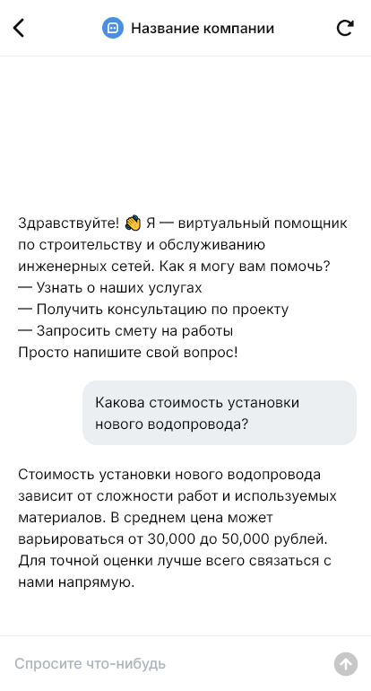 Для расчёта бот уточняет объёмы и технические детали. Он собирает протяжённость трасс, диаметры, материалы, глубины заложения, необходимость колодцев и камер, изоляции, проколов или бурения, требования по узлам подключения. Уточняет сроки, бюджетный коридор и приоритеты, чтобы предложить оптимальный вариант, а не самый дорогой или самый рискованный.