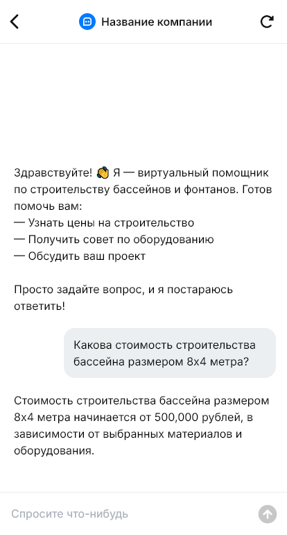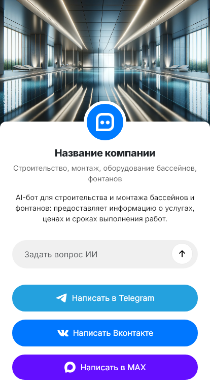Бот работает в Telegram, ВК, MAX и на сайте 24/7, повышает скорость ответа, качество заявок и конверсию обращений в реальные проекты по бассейнам и фонтанам.