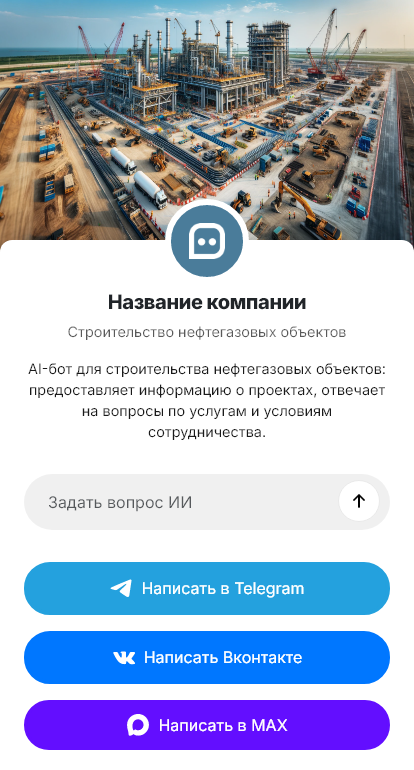 Бот для подрядчика в нефтегазовом строительстве помогает собрать исходные данные и подготовить заявку. Он уточняет тип объекта (КС, НПС, трубопровод, площадка, склад), регион, этап проекта, наличие проектной документации, сроки, требования по допускам и охране труда, объём работ, потребность в поставках и технике. Бот может запросить ТЗ, ведомости и контакты для дальнейшего согласования.