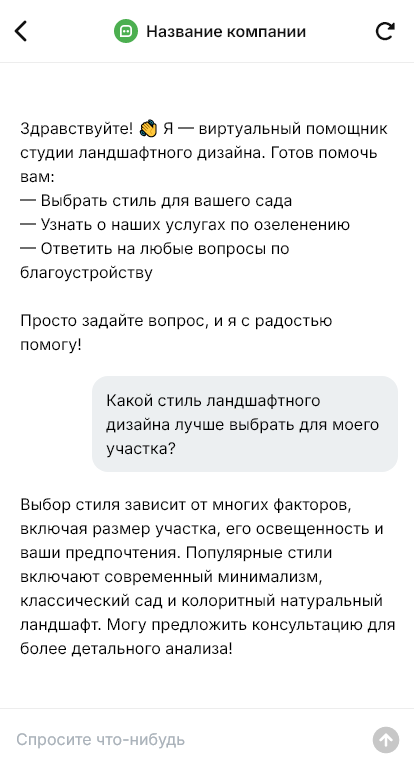Бот может объяснить этапы работ: эскиз и концепция, дендроплан, освещение, дорожки, автополив, смета, реализация и сопровождение. Он помогает заказчику понять, что можно сделать в рамках бюджета и какие решения дают максимальный эффект без «переплаты за декор».