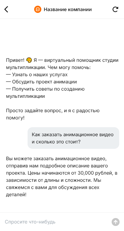 Внедрение настраивается под производство: типовые пакеты, этапы (бриф → сценарий → сториборд → аниматик → финальная анимация → звук), правила согласования и количества правок, сроки по этапам, интеграция с CRM. Бот помогает объяснить, почему «одна минута» может стоить по‑разному, и как формируется смета.