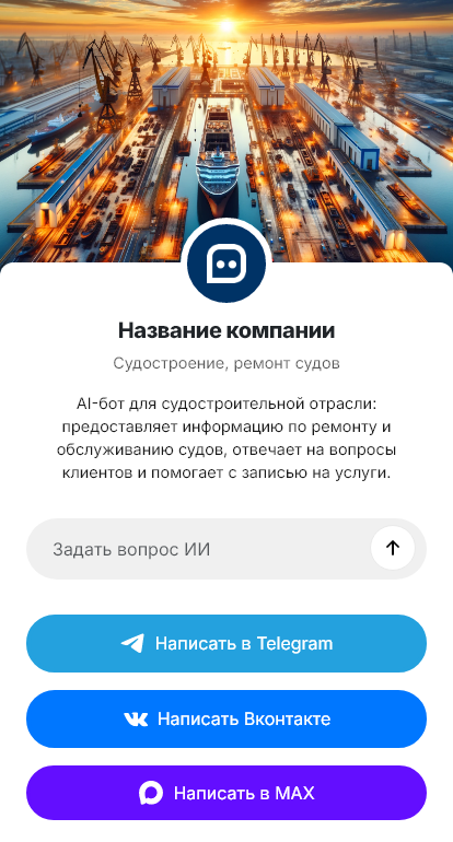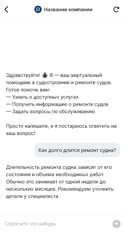 Внедрение настраивается под вашу верфь или ремонтную базу: направления работ, процессы обследования, интеграция с CRM и планированием, статусы согласований. Бот может назначать первичную консультацию, собирать документы для КП, фиксировать этапы проекта и поддерживать коммуникацию по статусам ремонта.