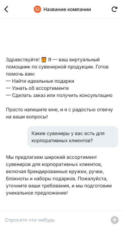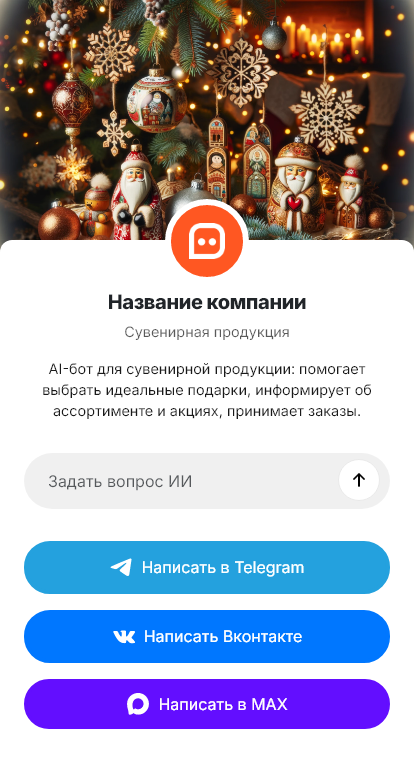 Бот работает в Telegram, ВК, MAX и на сайте 24/7, повышая скорость ответа и конверсию обращений по сувенирной продукции в реальные заказы.
