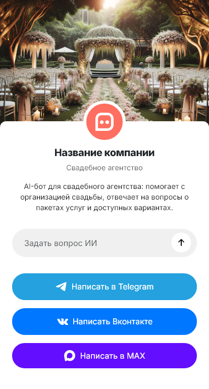 Внедрение настраивается под процессы агентства: пакеты услуг, сроки подготовки, правила бронирования, предоплата, список проверенных подрядчиков, этапы согласования, интеграция с CRM. Бот помогает объяснить путь: бриф → концепция → смета → договор → подготовка → день свадьбы.
