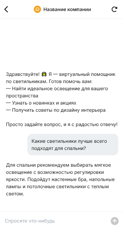 Чат-бот уточняет тип помещения (кухня, гостиная, спальня, офис), площадь и высоту потолка, стиль (лофт, минимализм, классика), предпочтения по свету (тёплый/нейтральный/холодный), необходимость подсветки зон и диммирования. По сценарию бот рекомендует тип решения: люстра, трек, подвес, споты, бра, торшер, подсветка. Далее бот помогает выбрать лампы и расходники, отвечает на вопросы про монтаж, гарантию и возврат.