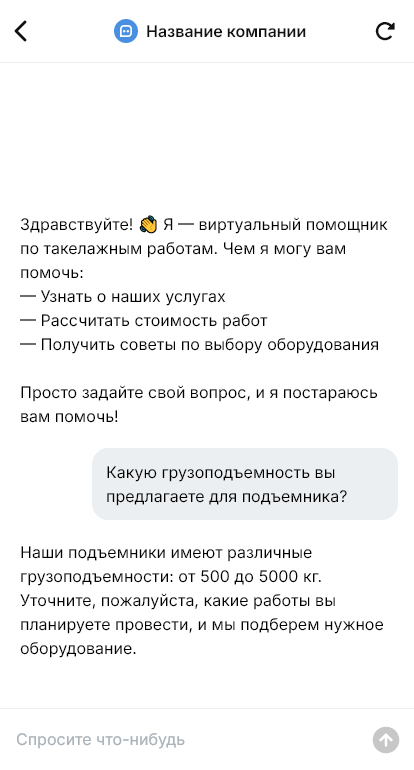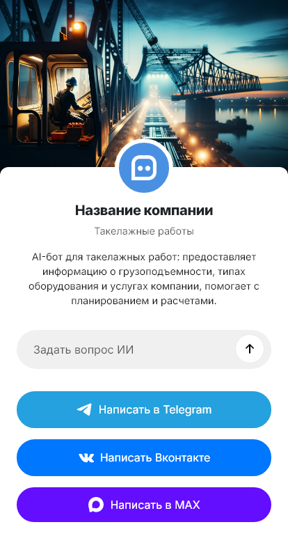 Внедрение настраивается под вашу компанию: виды работ, парк оборудования (краны, лебёдки, ролики), тарифы, зоны, интеграция с CRM и календарём. Бот может назначать обследование объекта, фиксировать договорённости, отправлять чек‑лист подготовки площадки и требования по безопасности.