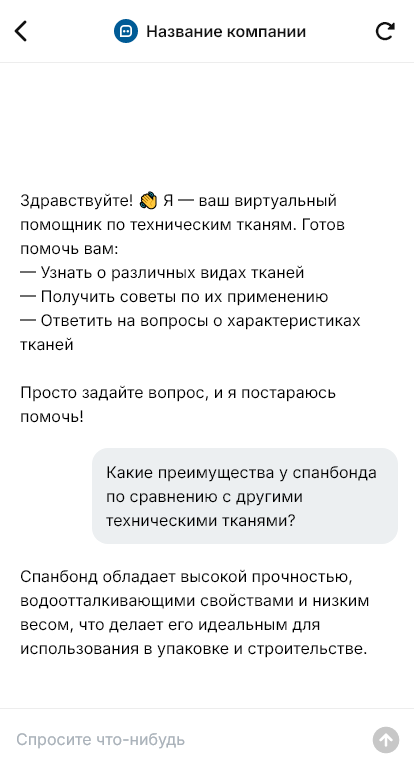 В итоге технические ткани продаются быстрее и точнее, уменьшаются пересогласования и споры, а поставщик получает долгосрочные отношения благодаря боту, который фиксирует требования и сопровождает отбор и поставку.
