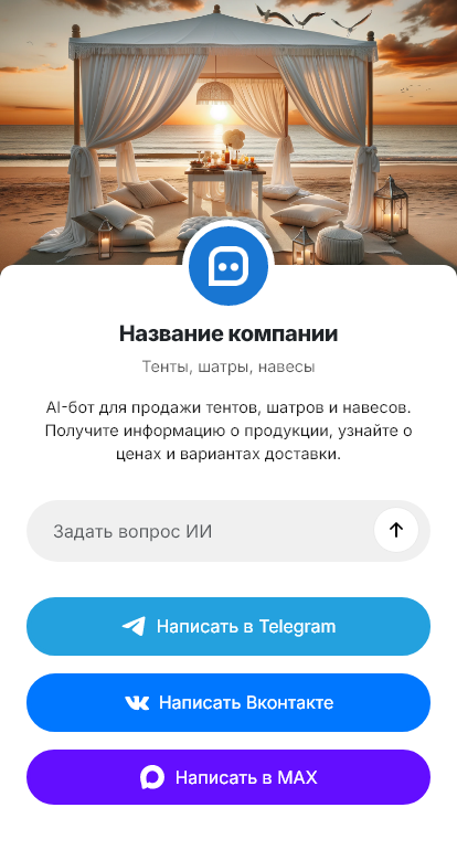 Тенты, шатры и навесы заказывают под конкретную задачу: защита от солнца и дождя, торговые и ивент-площадки, сезонные кафе, парковки, склады, частные дворы. Клиенты присылают фото места установки и спрашивают «какой вариант лучше» и «сколько будет стоить». Без структурированного брифа расчёт превращается в долгую переписку и часть лидов теряется. Бот для тентов, шатров и навесов помогает быстро собрать параметры, дать ориентир и довести клиента до замера и заказа.