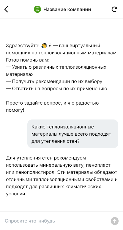 Чат-бот уточняет, где нужна теплоизоляция, какие условия (влажность, температура, нагрузка), тип основания и желаемый результат. Затем бот предлагает подходящие материалы и объясняет отличия простым языком: где лучше использовать минеральную вату, где — XPS, где требуется пароизоляция и мембраны. По сценарию бот помогает рассчитать количество: по площади, толщине, кратности упаковок, добавляя запас, и сразу предлагает сопутствующие товары — крепёж, клеевые составы, ленты, мембраны и инструмент.