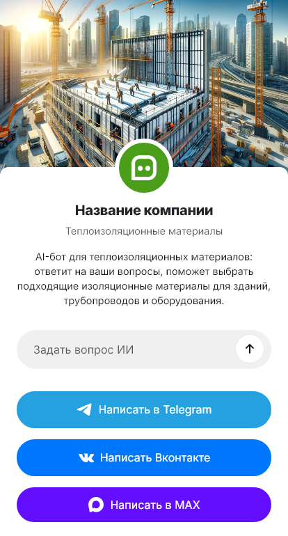 Бот работает в Telegram, ВК, MAX и на сайте 24/7, снижает нагрузку на консультантов и повышает конверсию обращений по теплоизоляционным материалам в реальные покупки.