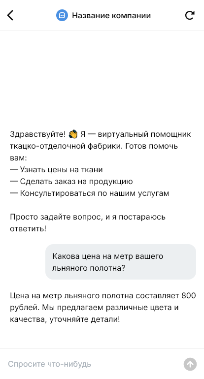 Бот для ткацко-отделочной фабрики помогает собирать технические запросы как на входе в производство. Он уточняет назначение ткани, ключевые параметры, тип отделки и требования, объём, регулярность поставок, сроки, географию, просит прикрепить ТЗ или спецификацию. После этого бот формирует структурированную заявку и передаёт её ответственному менеджеру или технологу.