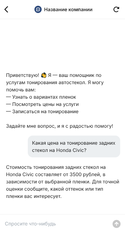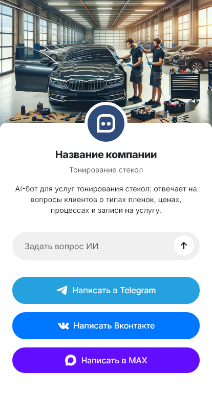 Внедрение настраивается под вашу студию: виды плёнок, прайс, длительность работ, расписание, интеграция с CRM и календарём. Бот может отправлять клиенту памятку: сколько времени нельзя опускать стекла, когда можно мыть машину, как избежать повреждений. Для корпоративных клиентов бот может оформлять заявки на тонировку автопарка и согласовывать график.