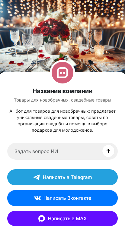 Бот помогает собрать подготовку в понятную систему. Он уточняет дату, формат свадьбы, количество гостей, место, стиль и палитру, бюджет и сроки. После этого бот предлагает наборы: для церемонии, для банкета, для фотозоны, для подарков гостям — и объясняет, что входит и почему этого достаточно, чтобы событие выглядело цельно.