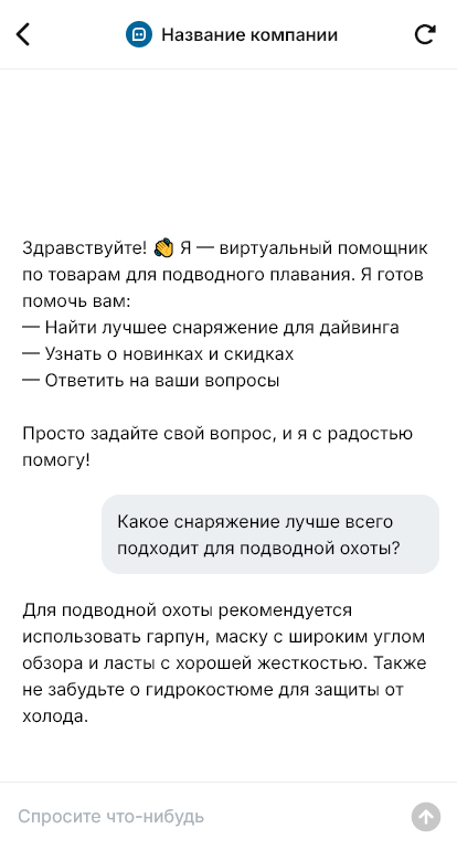 Чат-бот уточняет уровень подготовки (новичок/опытный), формат (дайвинг/снорклинг), условия воды и сезон, рост и размеры, бюджет и предпочтения. Затем бот предлагает варианты, объясняет отличия, помогает подобрать размер, рекомендует аксессуары и расходники, отвечает по доставке и гарантиям, собирает контакты и передаёт заявку консультанту при необходимости.