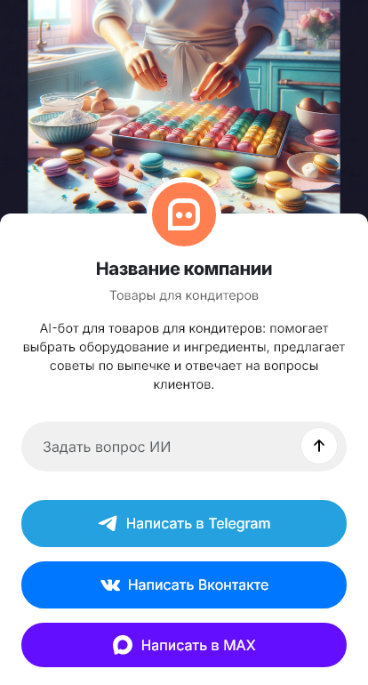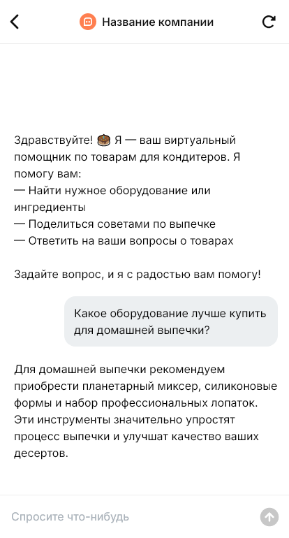 Бот берет на себя первичную консультацию и подбор. Он уточняет, что вы готовите, торт, пряники, муссовые десерты, макаронс, и предлагает подходящие ингредиенты и инструменты. Он помогает подобрать упаковку по размеру изделия, подсказывает, какие расходники понадобятся, и собирает заказ по чек листу, чтобы ничего не забыли. Для профессионалов бот может работать как быстрый помощник, принять список позиций, уточнить фасовку и бренды, показать наличие и сформировать заявку на счет.