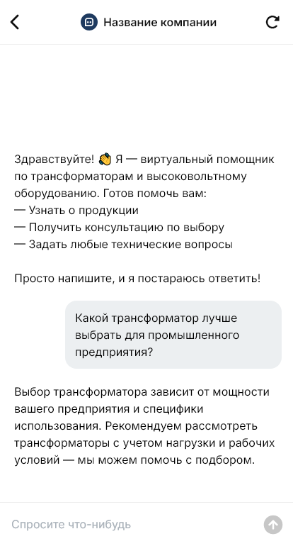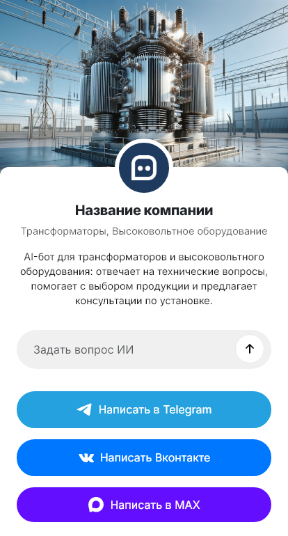 Бот для поставщика высоковольтного оборудования помогает собрать исходные параметры и подготовить заявку для инженера. Он уточняет тип объекта (подстанция, предприятие, стройка), требуемую мощность, входное/выходное напряжение, схему подключения, режим работы (пики, постоянная нагрузка), условия среды, необходимость защиты, измерения и автоматики. Если речь о замене, бот просит фото шильдика, год выпуска, причины замены и ограничения по габаритам.