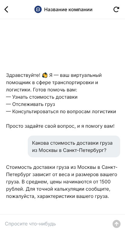 Бот помогает структурировать запрос и сделать его «расчётным» с первого контакта. Он уточняет направление и точки маршрута, параметры груза, требуемый транспорт и режим, сроки, условия загрузки/разгрузки, документы и контакт для КП. Если нужно, бот запрашивает инвойс, упаковочный лист или фото груза, чтобы менеджер быстрее предложил оптимальный вариант перевозки и сервисов.