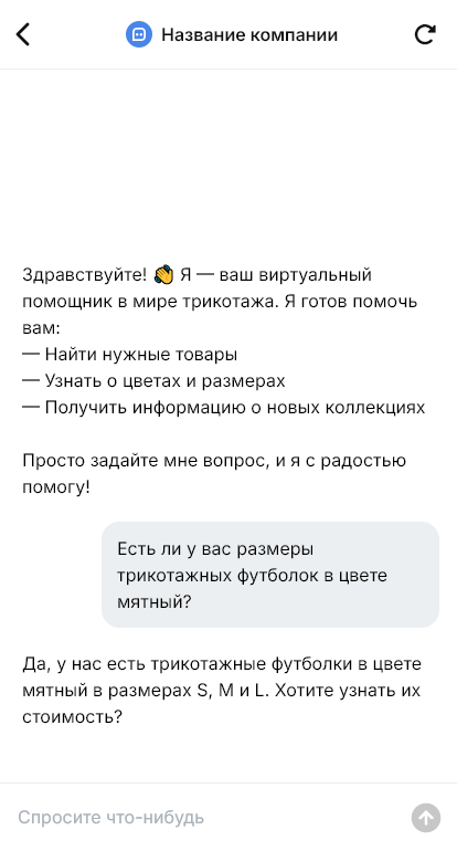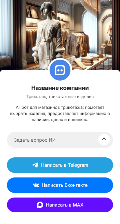 Трикотажные изделия часто выбирают по размеру, посадке, составу и сезону. Покупатели спрашивают о наличии, таблицах размеров, материалах и доставке. Если отвечать медленно, заказ уходит. Бот для трикотажа автоматизирует первичную консультацию и помогает доводить диалог до покупки.