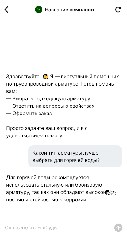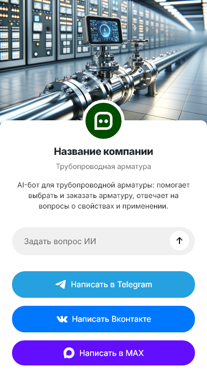 Бот работает в Telegram, ВК, MAX и на сайте 24/7, повышает скорость реакции и конверсию обращений по трубопроводной арматуре в реальные поставки.