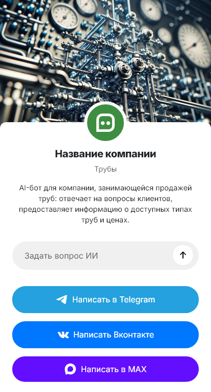 Бот работает в Telegram, ВК, MAX и на сайте 24/7, ускоряя обработку обращений и повышая конверсию запросов на трубы в реальные заказы и отгрузки.