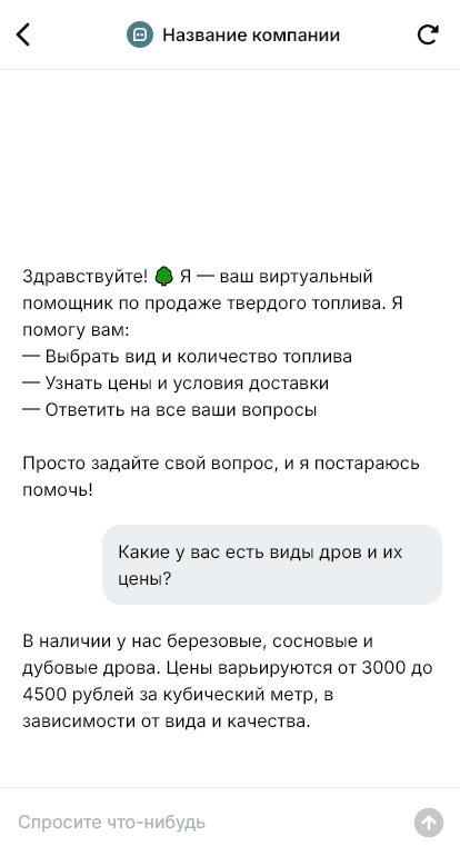 Бот помогает быстро оформить заказ и собрать все необходимые детали. Он уточняет тип топлива, объем и формат, насыпью или в мешках, требования к фракции и влажности, а также условия хранения и потребления. Он спрашивает адрес и условия подъезда, нужна ли разгрузка, какой интервал приемки, и помогает выбрать удобный график доставки. Для юридических лиц бот принимает реквизиты и формирует заявку на счет, а также может предложить регулярные поставки по расписанию, чтобы клиент не вспоминал о закупке в последний момент. Если клиент сомневается, бот объясняет отличия видов топлива и помогает подобрать вариант по бюджету и задаче.