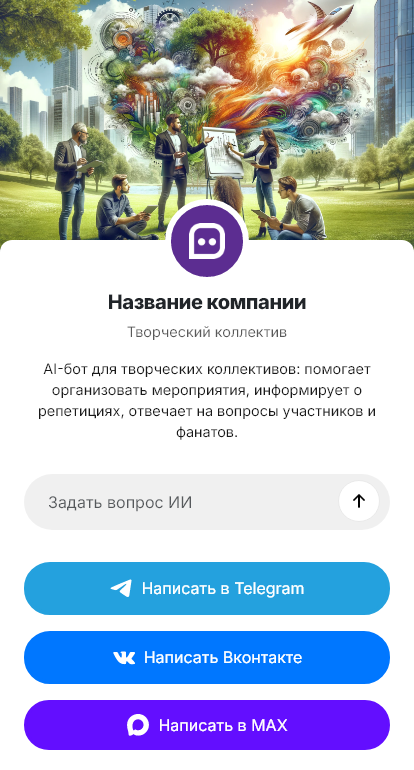 Бот работает в Telegram, VK, MAX и на сайте и настраивается под ваш стиль и сценарии. В результате меньше ручной рутины и больше подтверждённых проектов.