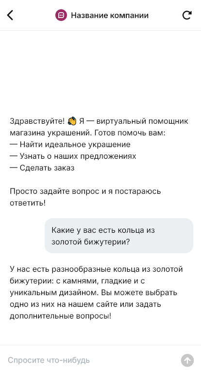 Внедрение выполняется под ваш магазин: категории, коллекции, размерные правила, упаковка подарков, акции и доставка. Можно настроить сценарии «подбор подарка за минуту», «комплект украшений под образ» и ответы на популярные вопросы по аллергенности материалов без медицинских обещаний.
