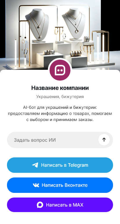 Бот работает в Telegram, ВК, MAX и на сайте 24/7, повышая конверсию обращений по украшениям и бижутерии в реальные заказы.
