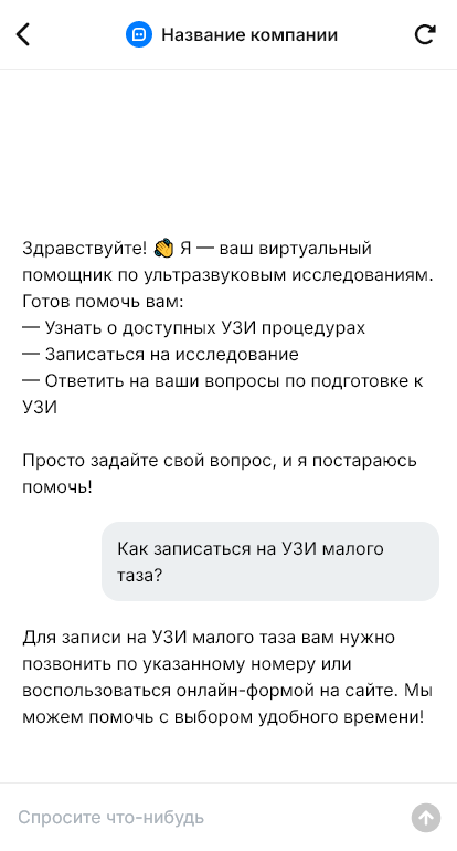 Ультразвуковые исследования — популярная услуга, и пациенты часто хотят записаться быстро, без звонков. Люди уточняют свободные окна, стоимость, подготовку, сколько длится процедура, какие документы взять и как перенести визит. При ручной переписке ответы приходят с задержкой, а часть обращений теряется, особенно если поток идёт из рекламы. Кроме того, важна точность данных, чтобы запись соответствовала нужному типу исследования и времени.