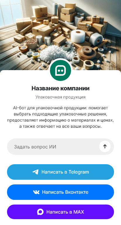 Бот работает в Telegram, ВК, MAX и на сайте 24/7, ускоряет обработку обращений и повышает конверсию запросов по упаковке в реальные поставки.