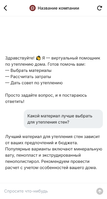 Затем бот объясняет варианты утепления и типичные ошибки: почему важна пароизоляция, как влияет вентиляция, как избежать плесени и «запирания влаги», в каких случаях нужен расчёт точки росы. Бот даёт ориентир по бюджету и предлагает записаться на выезд инженера или консультацию. Контакты и материалы фиксируются и передаются специалисту или в CRM — инженер получает структурированную заявку и быстрее готовит предложение.