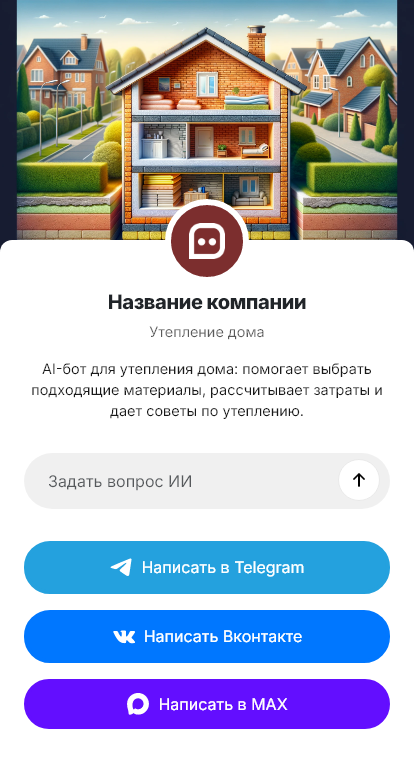 Бот работает в Telegram, ВК, MAX и на сайте 24/7, помогая не терять входящие обращения и превращать запросы на утепление дома в реальные проекты.