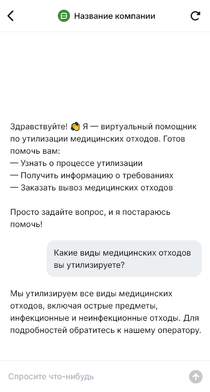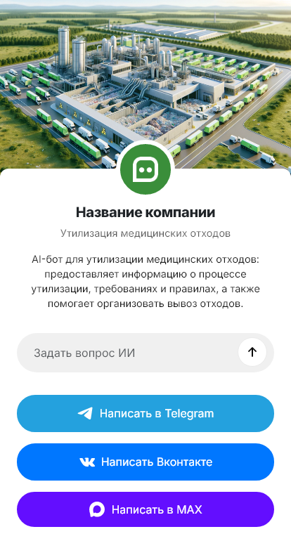 Бот для компании по обращению с медотходами помогает стандартизировать первичное общение. Он уточняет тип организации, классы отходов, примерные объёмы и регулярность, наличие контейнеров/пакетов и необходимость предоставления тары, условия хранения и точки забора, требования к пропускам и режиму работы. Бот также собирает реквизиты и контакт ответственного, чтобы подготовить договор, акты и остальные необходимые документы.