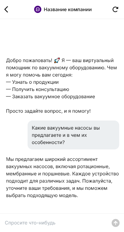 В сопровождении бот держит монтаж и сервис. Он сообщает статусы, поставка, пусконаладка, обучение, и хранит инструкции по обслуживанию, замена масла, фильтров, проверка уплотнений, тест на утечки. При неисправностях бот принимает заявки, собирает показатели, фото, видео и серийные номера, ускоряя реакцию сервиса. В итоге вакуумные системы внедряются быстрее и работают стабильнее, потому что бот помогает правильно собрать параметры и сопровождать эксплуатацию.