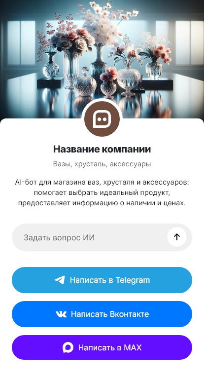 Бот работает в Telegram, ВК, MAX и на сайте 24/7, повышая конверсию обращений по вазам, хрусталю и аксессуарам в реальные заказы.