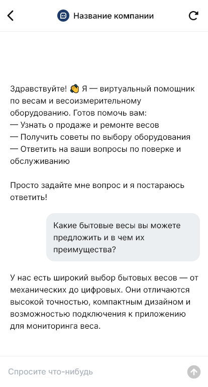Дальше бот помогает подготовить коммерческое предложение без лишних звонков: фиксирует желаемые сроки, адрес поставки, потребность в монтаже, пусконаладке и поверке, а также сервисные условия и расходники. Для проектных решений бот может собрать информацию о количестве точек взвешивания, необходимости выносных индикаторов, программного обеспечения и автоматизации участка.