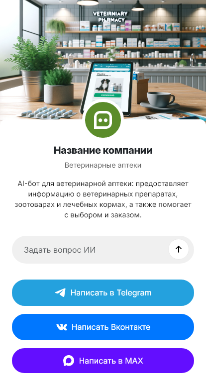 Бот работает в Telegram, ВК, MAX и на сайте 24/7, ускоряя обработку обращений и повышая конверсию запросов в реальные продажи ветеринарной аптеки.