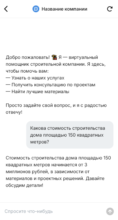 Внедрение выполняется под ваш формат «визитки»: блоки услуг, портфолио, прайс-ориентиры, география, график. Можно настроить сценарии для разных услуг и типов объектов, а также автоответы на типовые вопросы про договор, гарантию, материалы и сроки.