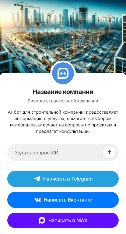 Бот работает в Telegram, ВК, MAX и на сайте 24/7, превращая визитку строительной компании в полноценную точку входа для заявок и продаж.