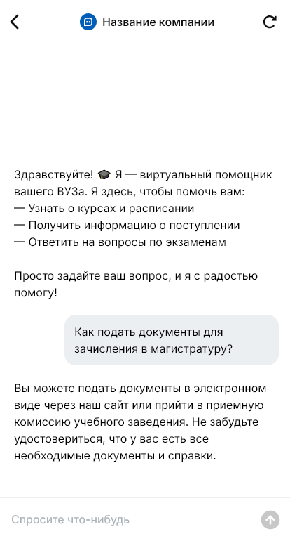 Внедрение учитывает структуру ВУЗа, регламенты и сценарии приёмной кампании. Итог — меньше повторяющихся вопросов, выше скорость ответа и больше завершённых заявок от абитуриентов.