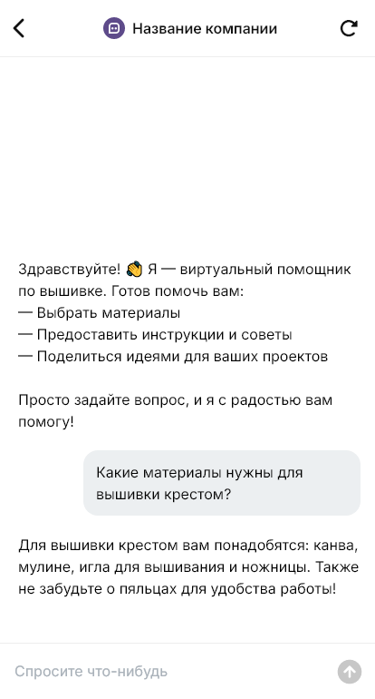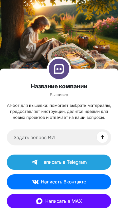 Бот для вышивки помогает собрать параметры и подготовить заказ. Он уточняет, что нужно вышить (логотип, надпись, рисунок), на каком изделии или материале, размер и место размещения, количество изделий, желаемые цвета, сроки и доставку. Бот может попросить загрузить изображение и подсказать требования к файлу, чтобы корректно сделать программу вышивки.