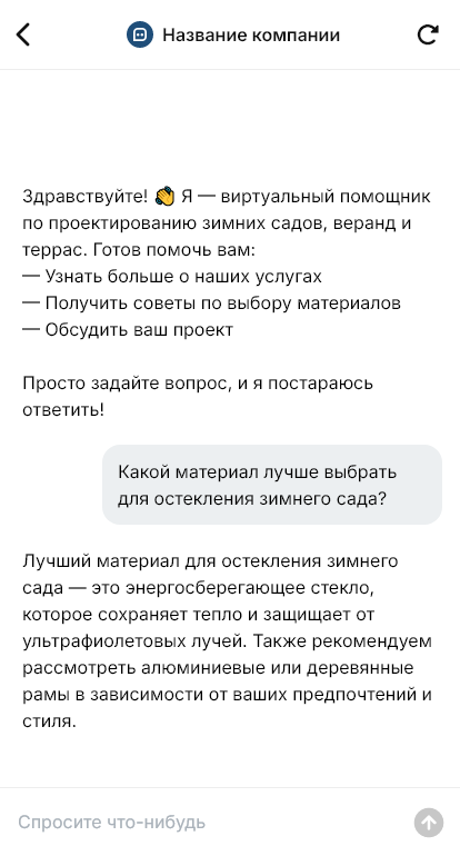Зимние сады, веранды и террасы — проекты, которые начинаются с вопросов и референсов: «хочу пристроить», «нужно остекление», «какая конструкция лучше», «сколько будет стоить под ключ». Клиенту важно быстро понять варианты (холодный/тёплый контур, остекление, кровля, утепление, отделка), сроки и этапы работ. Если переписка затягивается, мотивация падает, и лид уходит. Бот для зимних садов, веранд и террас помогает собрать бриф, дать ориентир и довести клиента до замера.