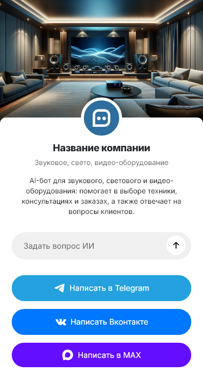 Внедрение настраивается под вашу компанию: каталог оборудования, пакеты услуг, прайс, логистика, интеграция с CRM и календарём, статусы согласования. Бот может назначать выезд на площадку, фиксировать техзадание, согласовывать райдер, отправлять КП и сопровождать проект до закрытия.